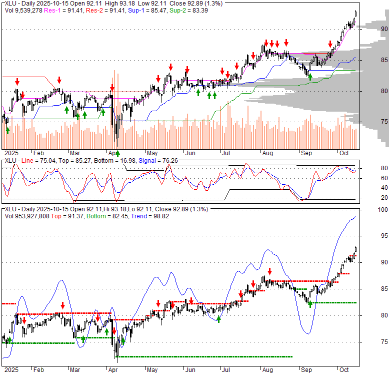 Price has closed above its short-term moving average. Short-term moving average is currently above mid-term; and above long-term moving average. From the relationship between price and moving averages: This stock is BULLISH in short-term; and BULLISH in mid-long term.[ XLU ] has closed below upper band by 6.7%. Bollinger Bands are 122.4% wider than normal. The large width of the bands suggest high volatility as compared to its normal range. The bands have been in this wide range for 9 days. This is a sign that the current trend might continue.