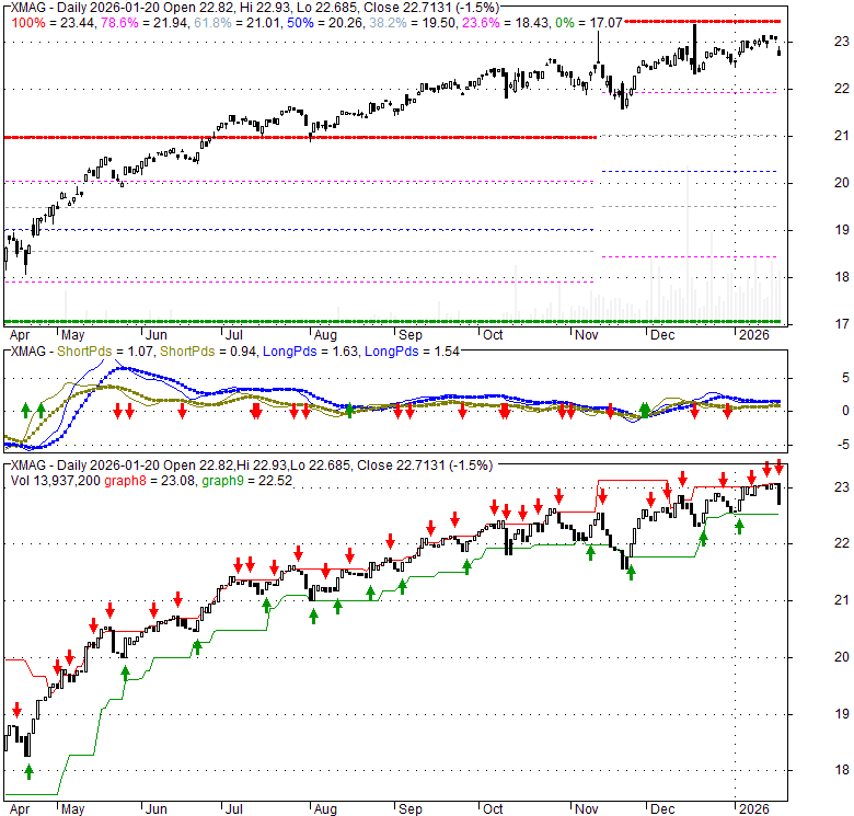 Price has closed below its short-term moving average. Short-term moving average is currently above mid-term; and above long-term moving average. From the relationship between price and moving averages: This stock is NEUTRAL in short-term; and BULLISH in mid-long term.[ XMAG ] has closed above bottom band by 27.4%. Bollinger Bands are 3.2% narrower than normal. The current width of the bands does not suggest anything about the future direction or movement of prices.