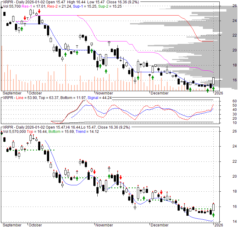 Price has closed above its short-term moving average. Short-term moving average is currently below mid-term; and below long-term moving average. From the relationship between price and moving averages: This stock is NEUTRAL in short-term; and NEUTRAL in mid-long term.[ XRPR ] has closed below upper band by 13.2%. Bollinger Bands are 0% narrower than normal.