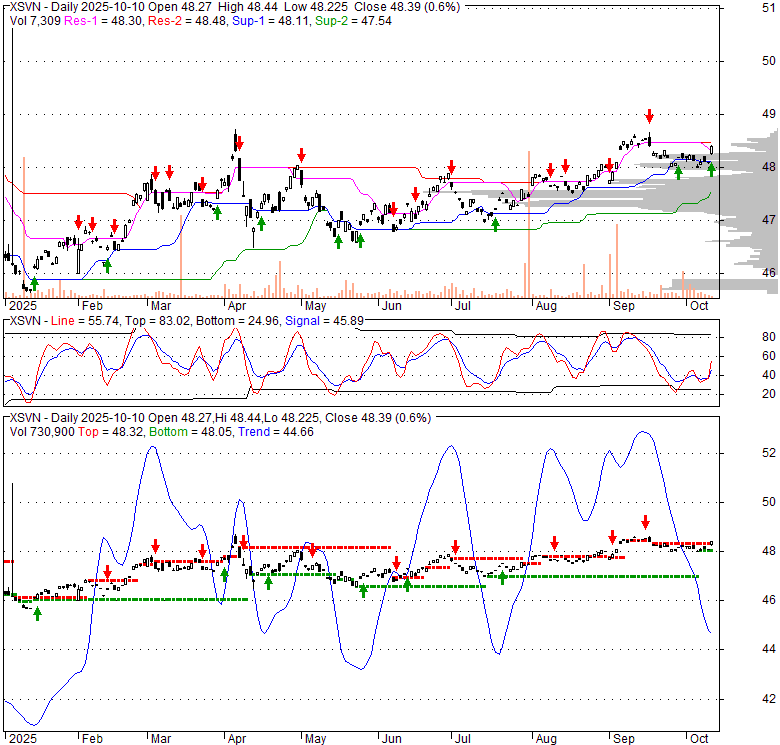 Price has closed above its short-term moving average. Short-term moving average is currently above mid-term; and above long-term moving average. From the relationship between price and moving averages: This stock is BULLISH in short-term; and BULLISH in mid-long term.[ XSVN ] has closed It is unclear right now based on current values. 51.2% narrower than normal. The narrow width of the bands suggests low volatility as compared to its normal range. The bands have been in this narrow range for 3 bars. This is a sign that the market may be about to initiate a new trend.
