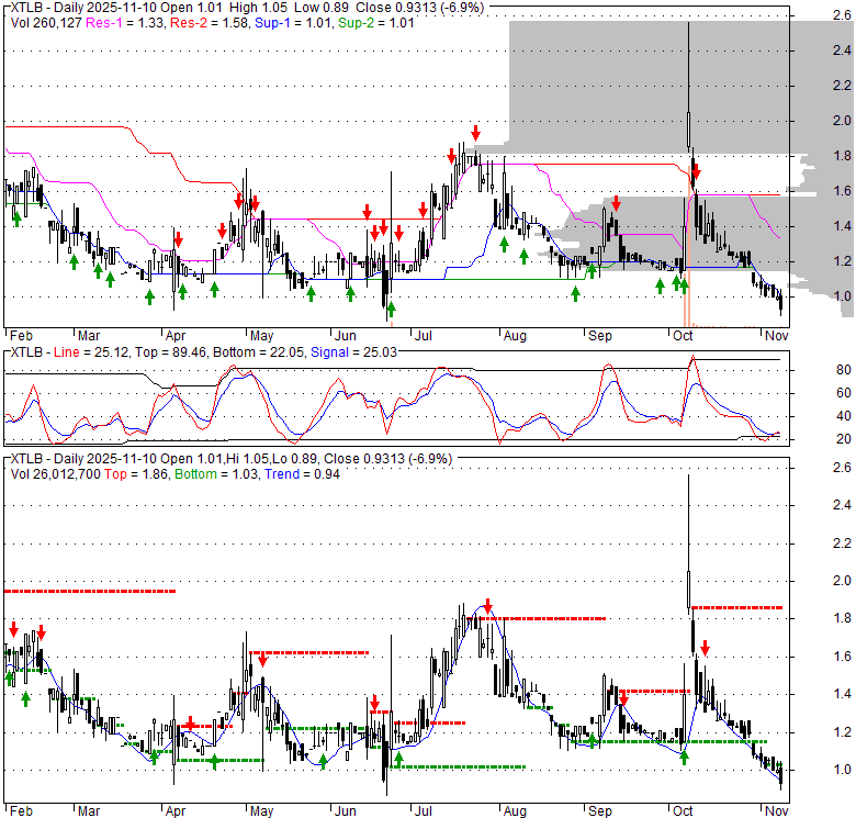 Price has closed below its short-term moving average. Short-term moving average is currently below mid-term; and below long-term moving average. From the relationship between price and moving averages: This stock is BEARISH in short-term; and BEARISH in mid-long term.[ XTLB ] has closed above bottom band by 22.5%. Bollinger Bands are 22.3% narrower than normal. The current width of the bands does not suggest anything about the future direction or movement of prices.