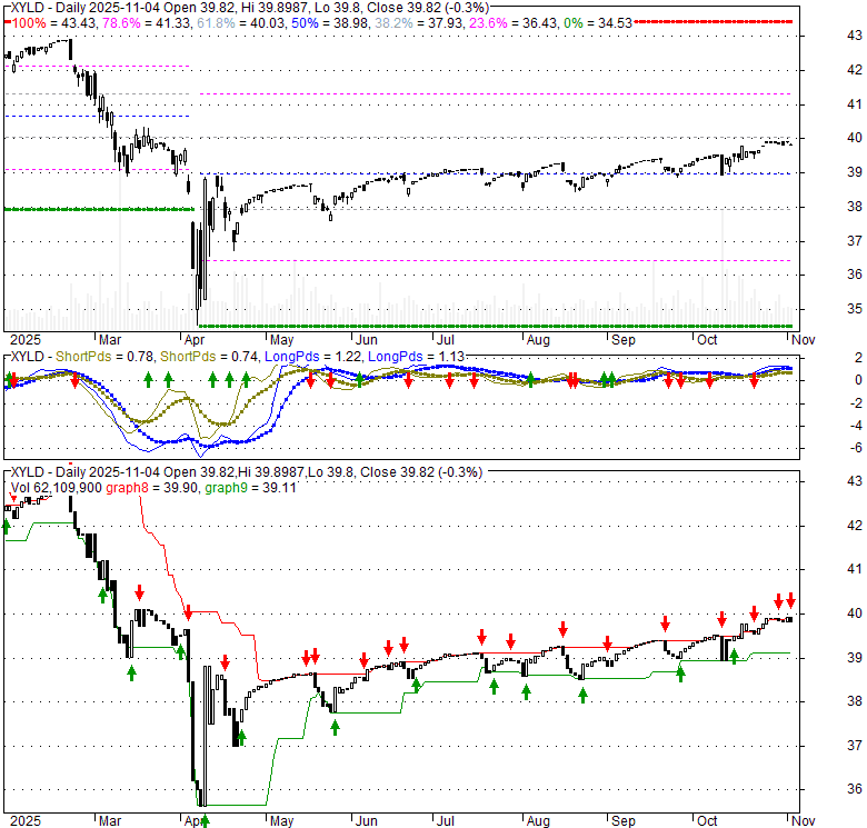 Price has closed below its short-term moving average. Short-term moving average is currently above mid-term; and above long-term moving average. From the relationship between price and moving averages: This stock is NEUTRAL in short-term; and BULLISH in mid-long term.[ XYLD ] has closed below upper band by 36.3%. Bollinger Bands are 7.5% narrower than normal. The current width of the bands does not suggest anything about the future direction or movement of prices.