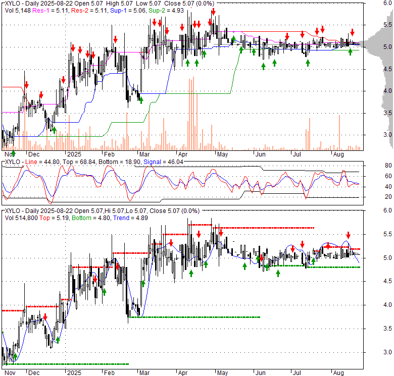 Price has closed below its short-term moving average. Short-term moving average is currently above mid-term; and below long-term moving average. From the relationship between price and moving averages: This stock is NEUTRAL in short-term; and NEUTRAL in mid-long term.[ XYLO ] has closed above bottom band by 45.3%. Bollinger Bands are 50.9% narrower than normal. The narrow width of the bands suggests low volatility as compared to its normal range. The bands have been in this narrow range for 15 bars. This is a sign that the market may be about to initiate a new trend.