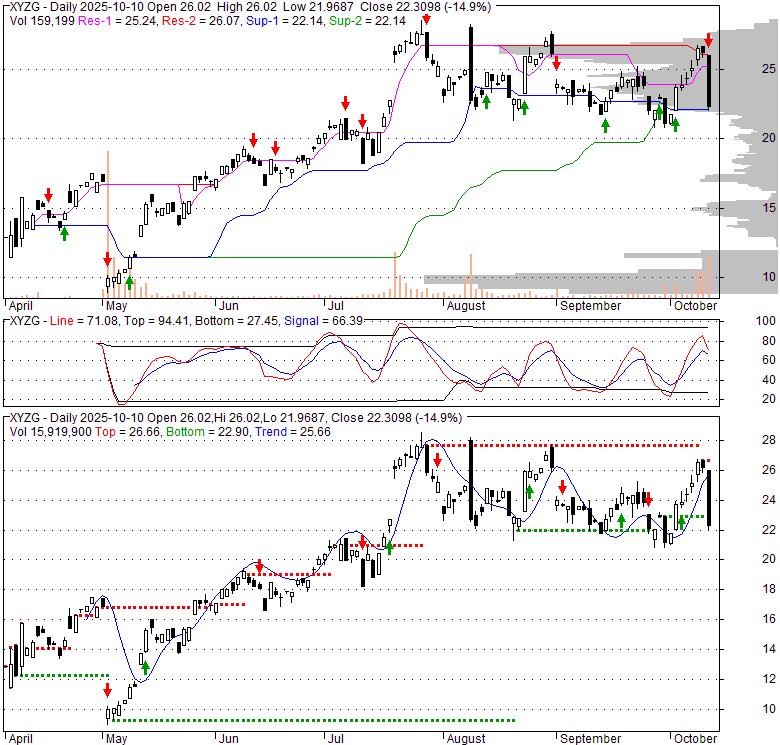 Price has closed below its short-term moving average. Short-term moving average is currently above mid-term; and above long-term moving average. From the relationship between price and moving averages: This stock is NEUTRAL in short-term; and BULLISH in mid-long term.[ XYZG ] has closed above bottom band by 27.3%. Bollinger Bands are 7.8% wider than normal. The current width of the bands does not suggest anything about the future direction or movement of prices.