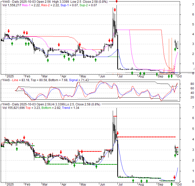 Price has closed below its short-term moving average. Short-term moving average is currently below mid-term; and below long-term moving average. From the relationship between price and moving averages: This stock is BEARISH in short-term; and BEARISH in mid-long term.[ YAAS ] has closed above bottom band by 14.3%. Bollinger Bands are 93.7% narrower than normal. The narrow width of the bands suggests low volatility as compared to its normal range. The bands have been in this narrow range for 52 bars. This is a sign that the market may be about to initiate a new trend.
