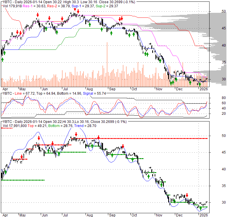 Price has closed above its short-term moving average. Short-term moving average is currently below mid-term; and below long-term moving average. From the relationship between price and moving averages: This stock is NEUTRAL in short-term; and BEARISH in mid-long term.[ YBTC ] has closed below upper band by 20.7%. Bollinger Bands are 61% narrower than normal. The narrow width of the bands suggests low volatility as compared to its normal range. The bands have been in this narrow range for 7 bars. This is a sign that the market may be about to initiate a new trend.
