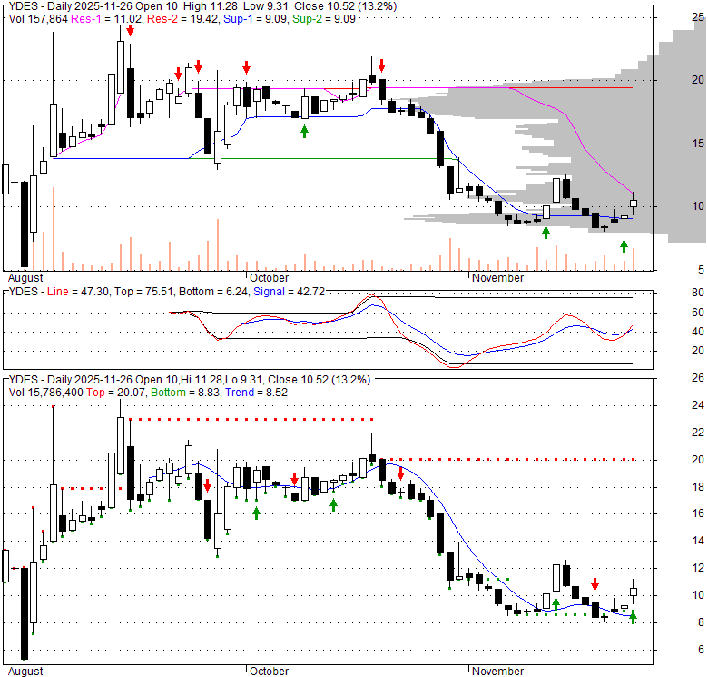 Price has closed above its short-term moving average. Short-term moving average is currently below mid-term; and below long-term moving average. From the relationship between price and moving averages: This stock is NEUTRAL in short-term; and NEUTRAL in mid-long term.[ YDES ] has closed below upper band by 24.6%. Bollinger Bands are 0% narrower than normal.
