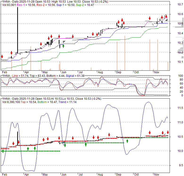 Price has closed below its short-term moving average. Short-term moving average is currently above mid-term; and above long-term moving average. From the relationship between price and moving averages: This stock is NEUTRAL in short-term; and BULLISH in mid-long term.[ YHNA ] has closed above bottom band by 42.1%. Bollinger Bands are 87.3% wider than normal. The large width of the bands suggest high volatility as compared to its normal range. The bands have been in this wide range for 5 days. This is a sign that the current trend might continue.