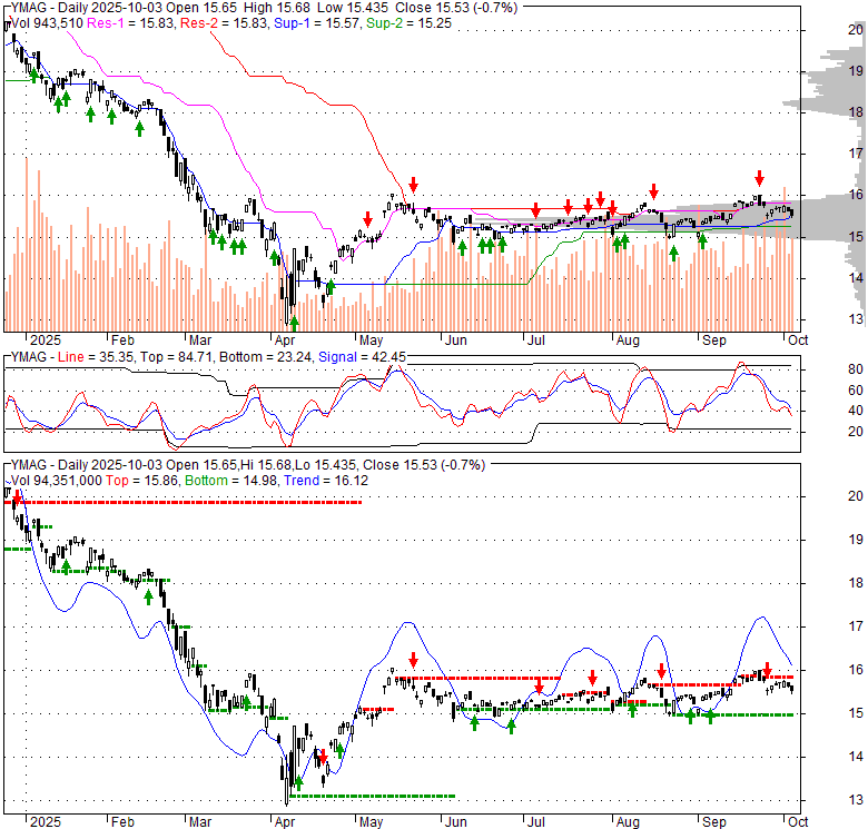 Price has closed below its short-term moving average. Short-term moving average is currently above mid-term; and above long-term moving average. From the relationship between price and moving averages: This stock is NEUTRAL in short-term; and BULLISH in mid-long term.[ YMAG ] has closed above bottom band by 5.7%. Bollinger Bands are 33.5% narrower than normal. The current width of the bands does not suggest anything about the future direction or movement of prices.