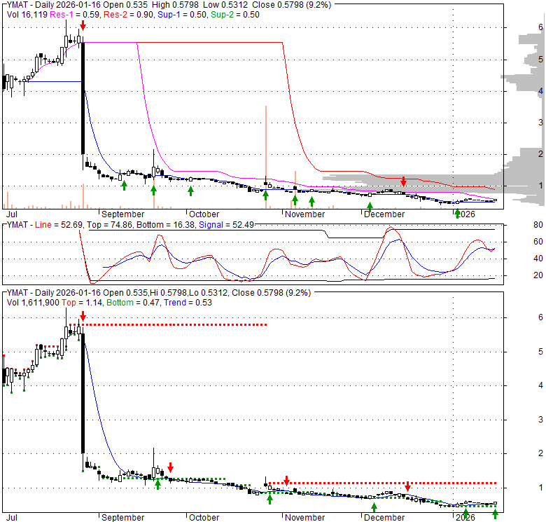 Price has closed above its short-term moving average. Short-term moving average is currently below mid-term; and below long-term moving average. From the relationship between price and moving averages: This stock is NEUTRAL in short-term; and BEARISH in mid-long term.[ YMAT ] has closed below upper band by 18.6%. Bollinger Bands are 86.5% narrower than normal. The narrow width of the bands suggests low volatility as compared to its normal range. The bands have been in this narrow range for {EMPTY} bars. This is a sign that the market may be about to initiate a new trend.
