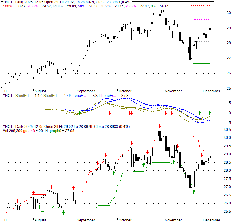 Price has closed above its short-term moving average. Short-term moving average is currently below mid-term; and above long-term moving average. From the relationship between price and moving averages: This stock is NEUTRAL in short-term; and NEUTRAL in mid-long term.[ YNOT ] has closed below upper band by 16.4%. Bollinger Bands are 0% narrower than normal.