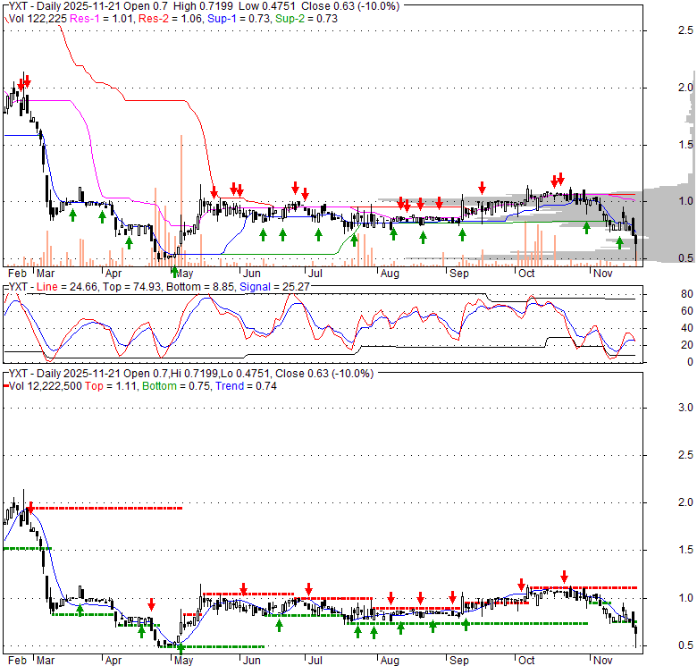 Price has closed below its short-term moving average. Short-term moving average is currently below mid-term; and below long-term moving average. From the relationship between price and moving averages: This stock is BEARISH in short-term; and NEUTRAL in mid-long term.[ YXT ] has closed below the lower bollinger band by 7.9%. If price is in a downtrend band; this downward trend might continue. However a short term pullback inside the band is likely. Bollinger Bands are 169.5% wider than normal. The large width of the bands suggest high volatility as compared to its normal range. The bands have been in this wide range for 8 days. This is a sign that the current trend might continue.