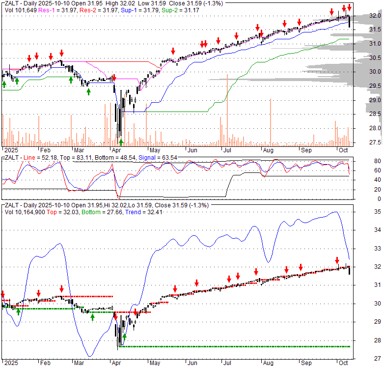 Price has closed below its short-term moving average. Short-term moving average is currently above mid-term; and above long-term moving average. From the relationship between price and moving averages: This stock is NEUTRAL in short-term; and BULLISH in mid-long term.[ ZALT ] has closed below the lower bollinger band by 26.3%. If price is in a downtrend band; this downward trend might continue. However a short term pullback inside the band is likely. Bollinger Bands are 1.4% wider than normal. The current width of the bands does not suggest anything about the future direction or movement of prices.