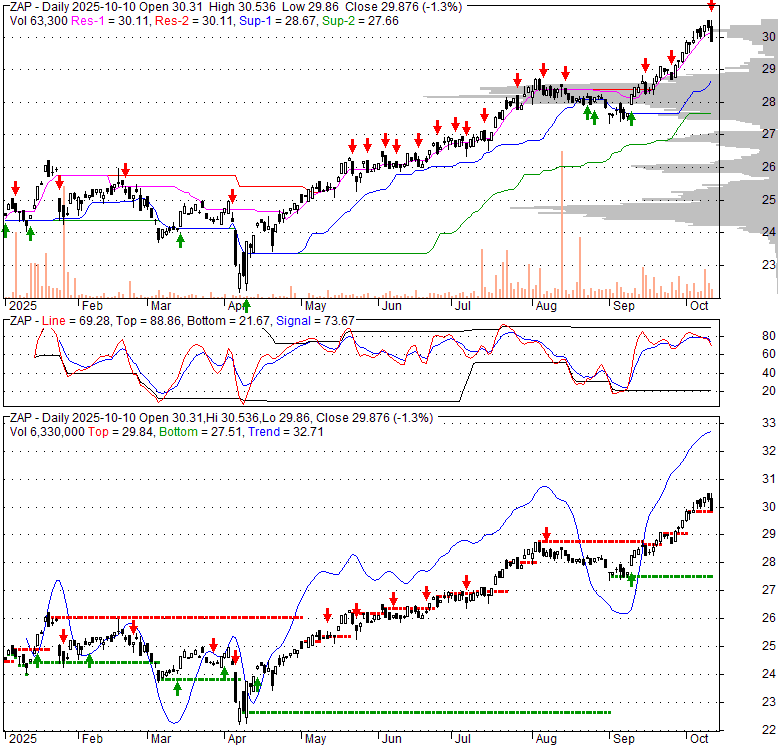 Price has closed below its short-term moving average. Short-term moving average is currently above mid-term; and above long-term moving average. From the relationship between price and moving averages: This stock is NEUTRAL in short-term; and BULLISH in mid-long term.[ ZAP ] has closed below upper band by 35.7%. Bollinger Bands are 66.1% wider than normal. The large width of the bands suggest high volatility as compared to its normal range. The bands have been in this wide range for 7 days. This is a sign that the current trend might continue.