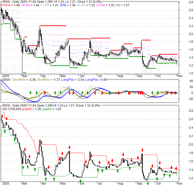 Price has closed above its short-term moving average. Short-term moving average is currently below mid-term; and below long-term moving average. From the relationship between price and moving averages: This stock is NEUTRAL in short-term; and BEARISH in mid-long term.[ ZENV ] has closed below upper band by 49.2%. Bollinger Bands are 80.1% narrower than normal. The narrow width of the bands suggests low volatility as compared to its normal range. The bands have been in this narrow range for 18 bars. This is a sign that the market may be about to initiate a new trend.