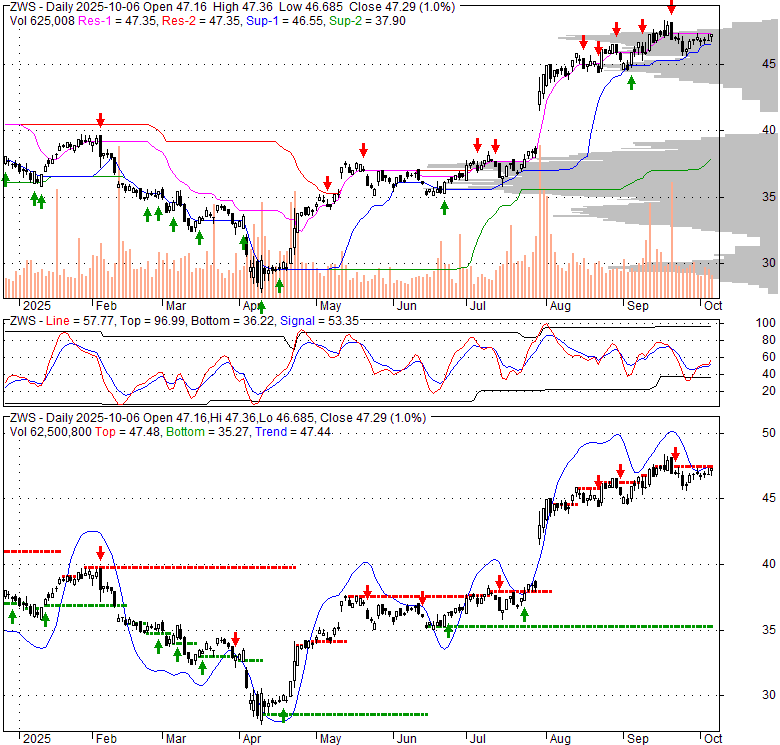 Price has closed above its short-term moving average. Short-term moving average is currently above mid-term; and above long-term moving average. From the relationship between price and moving averages: This stock is BULLISH in short-term; and BULLISH in mid-long term.[ ZWS ] has closed below upper band by 29.4%. Bollinger Bands are 53.7% narrower than normal. The narrow width of the bands suggests low volatility as compared to its normal range. The bands have been in this narrow range for 8 bars. This is a sign that the market may be about to initiate a new trend.