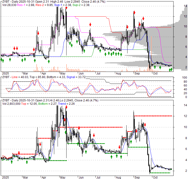 Price has closed above its short-term moving average. Short-term moving average is currently below mid-term; and below long-term moving average. From the relationship between price and moving averages: This stock is NEUTRAL in short-term; and BEARISH in mid-long term.[ ZYBT ] has closed above bottom band by 40.5%. Bollinger Bands are 80.6% narrower than normal. The narrow width of the bands suggests low volatility as compared to its normal range. The bands have been in this narrow range for 13 bars. This is a sign that the market may be about to initiate a new trend.