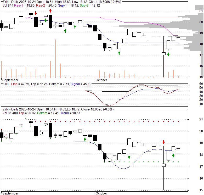 Price has closed above its short-term moving average. Short-term moving average is currently below mid-term; and below long-term moving average. From the relationship between price and moving averages: This stock is NEUTRAL in short-term; and NEUTRAL in mid-long term.[ ZYN ] has closed below upper band by 45.8%. Bollinger Bands are 0% narrower than normal.