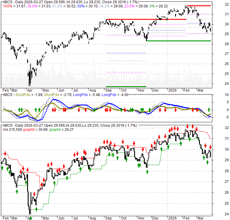 Price has closed below its short-term moving average. Short-term moving average is currently below mid-term; and below long-term moving average. From the relationship between price and moving averages: This stock is BEARISH in short-term; and NEUTRAL in mid-long term.[ ABCS ] has closed above bottom band by 13.5%. Bollinger Bands are 16.7% narrower than normal. The current width of the bands does not suggest anything about the future direction or movement of prices.