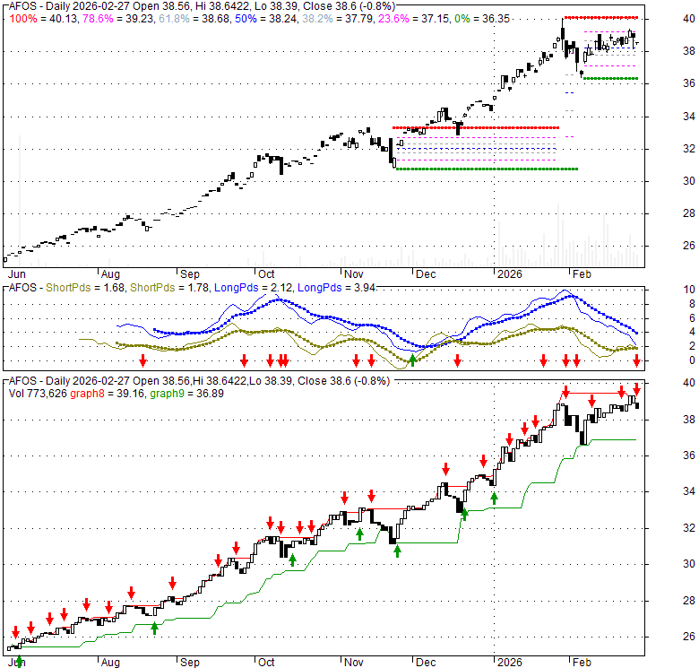 Price has closed below its short-term moving average. Short-term moving average is currently above mid-term; and above long-term moving average. From the relationship between price and moving averages: This stock is NEUTRAL in short-term; and BULLISH in mid-long term.[ AFOS ] has closed below upper band by 45.3%. Bollinger Bands are 38.5% narrower than normal. The current width of the bands does not suggest anything about the future direction or movement of prices.
