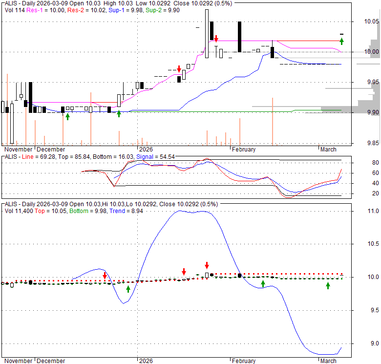 Price has closed above its short-term moving average. Short-term moving average is currently above mid-term; and below long-term moving average. From the relationship between price and moving averages: This stock is BULLISH in short-term; and NEUTRAL in mid-long term.[ ALIS ] has closed Bollinger Bands are 0% narrower than normal.