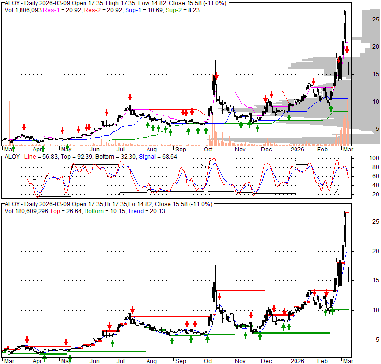 Price has closed below its short-term moving average. Short-term moving average is currently above mid-term; and above long-term moving average. From the relationship between price and moving averages: This stock is NEUTRAL in short-term; and BULLISH in mid-long term.[ ALOY ] has closed above bottom band by 43.4%. Bollinger Bands are 199.8% wider than normal. The large width of the bands suggest high volatility as compared to its normal range. The bands have been in this wide range for 9 days. This is a sign that the current trend might continue.