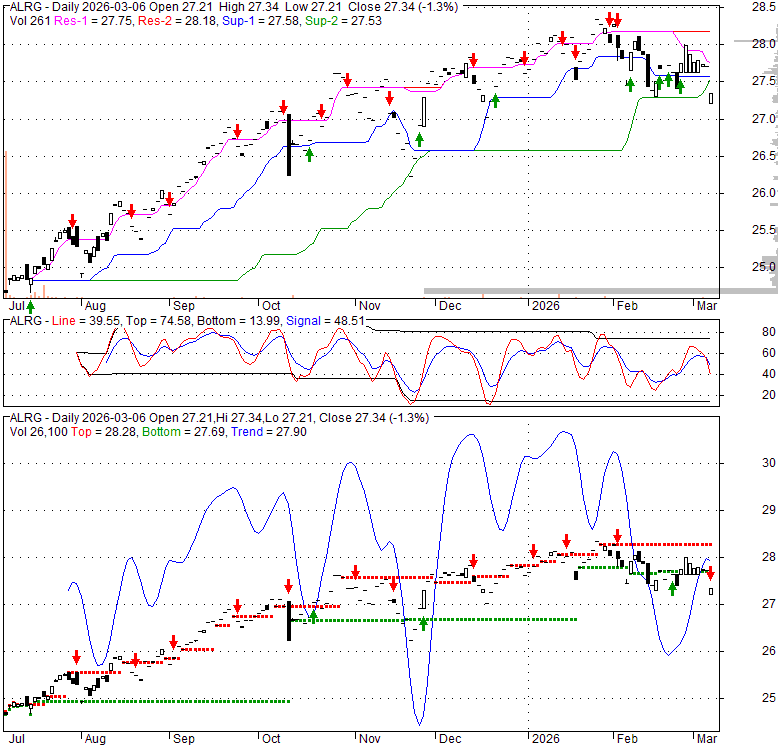 Price has closed below its short-term moving average. Short-term moving average is currently below mid-term; and above long-term moving average. From the relationship between price and moving averages: This stock is BEARISH in short-term; and NEUTRAL in mid-long term.[ ALRG ] has closed above bottom band by 6.4%. Bollinger Bands are 30.9% narrower than normal. The current width of the bands does not suggest anything about the future direction or movement of prices.