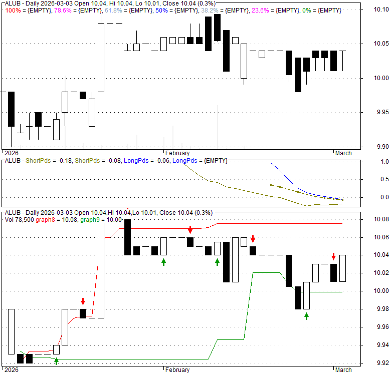 Price has closed above its short-term moving average. Short-term moving average is currently below mid-term; and below long-term moving average. From the relationship between price and moving averages: This stock is NEUTRAL in short-term; and NEUTRAL in mid-long term.[ ALUB ] has closed below upper band by 37.5%. Bollinger Bands are 0% narrower than normal.
