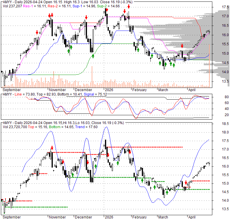 Price has closed below its short-term moving average. Short-term moving average is currently above mid-term; and above long-term moving average. From the relationship between price and moving averages: This stock is NEUTRAL in short-term; and NEUTRAL in mid-long term.[ AMYY ] has closed below upper band by 29.2%. Bollinger Bands are 12% narrower than normal. The current width of the bands does not suggest anything about the future direction or movement of prices.
