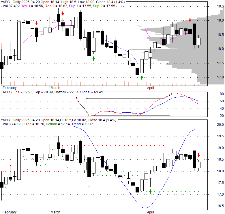 Price has closed below its short-term moving average. Short-term moving average is currently above mid-term; and below long-term moving average. From the relationship between price and moving averages: This stock is NEUTRAL in short-term; and NEUTRAL in mid-long term.[ APC ] has closed below upper band by 39.4%. Bollinger Bands are 0% narrower than normal.