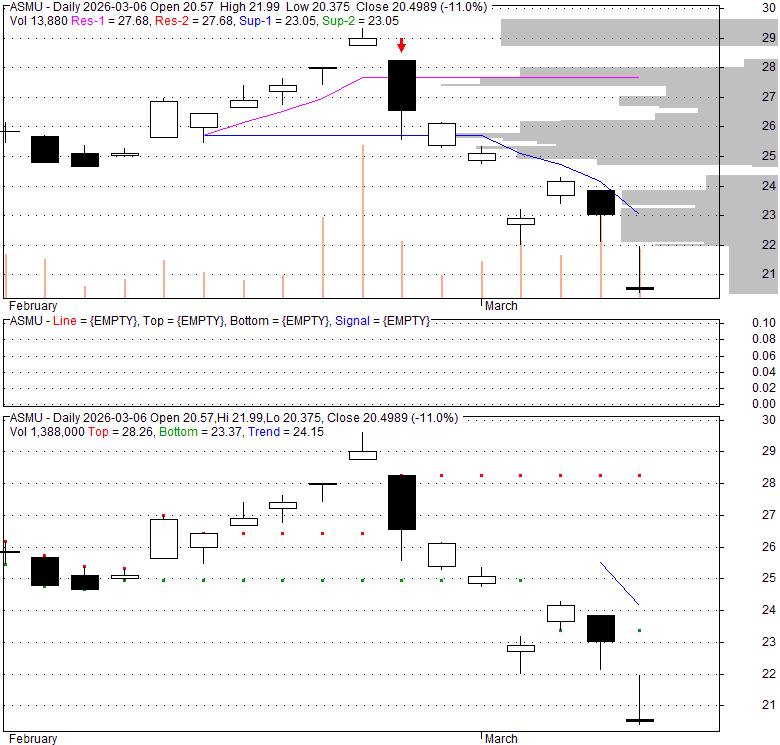 Price has closed below its short-term moving average. Short-term moving average is currently below mid-term; and below long-term moving average. From the relationship between price and moving averages: This stock is NEUTRAL in short-term; and NEUTRAL in mid-long term.[ ASMU ] has closed below the lower bollinger band by 8.4%. Bollinger Bands are 0% narrower than normal.