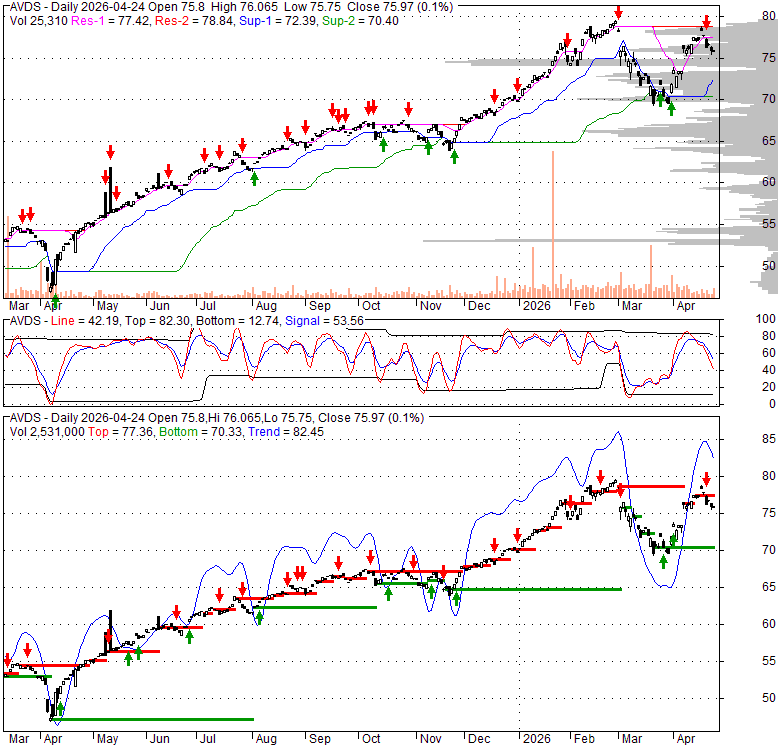 Price has closed above its short-term moving average. Short-term moving average is currently above mid-term; and above long-term moving average. From the relationship between price and moving averages: This stock is BULLISH in short-term; and BULLISH in mid-long term.[ AVDS ] has closed above bottom band by 44.1%. Bollinger Bands are 22.5% narrower than normal. The current width of the bands does not suggest anything about the future direction or movement of prices.