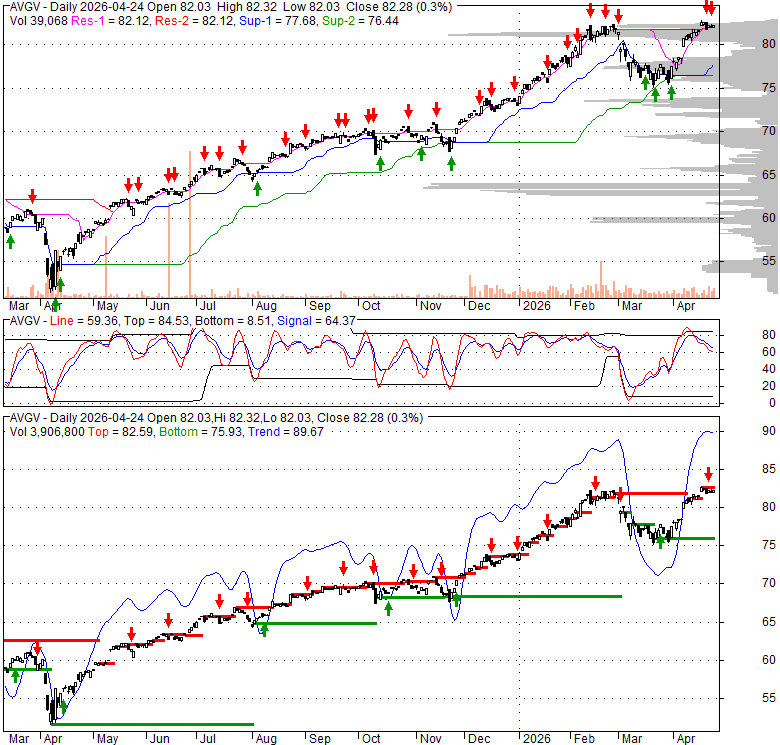 Price has closed above its short-term moving average. Short-term moving average is currently above mid-term; and above long-term moving average. From the relationship between price and moving averages: This stock is BULLISH in short-term; and BULLISH in mid-long term.[ AVGV ] has closed below upper band by 29.4%. Bollinger Bands are 12% narrower than normal. The current width of the bands does not suggest anything about the future direction or movement of prices.