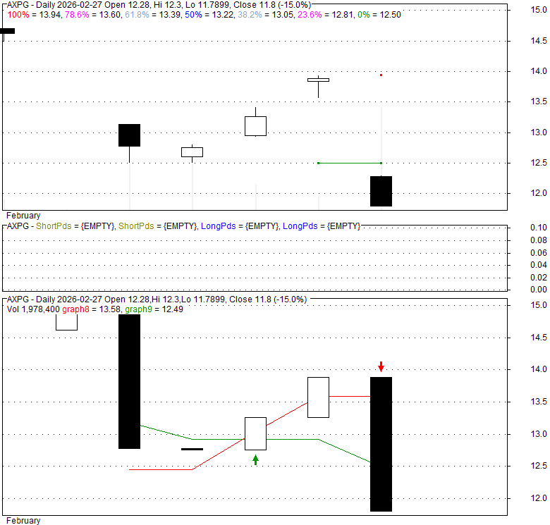 Price has closed below its short-term moving average. Short-term moving average is currently below mid-term; and below long-term moving average. From the relationship between price and moving averages: This stock is NEUTRAL in short-term; and NEUTRAL in mid-long term.[ AXPG ] has closed Bollinger Bands are 0% narrower than normal.