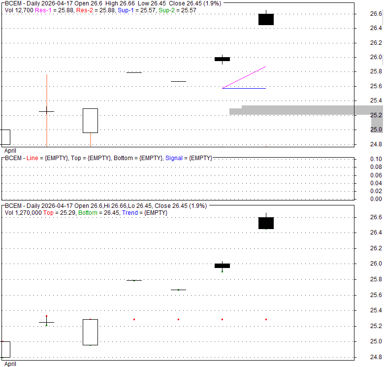 Price has closed above its short-term moving average. Short-term moving average is currently below mid-term; and below long-term moving average. From the relationship between price and moving averages: This stock is NEUTRAL in short-term; and NEUTRAL in mid-long term.[ BCEM ] has closed Bollinger Bands are 0% narrower than normal.