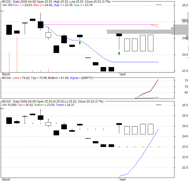 Price has closed above its short-term moving average. Short-term moving average is currently below mid-term; and below long-term moving average. From the relationship between price and moving averages: This stock is NEUTRAL in short-term; and NEUTRAL in mid-long term.[ BCGS ] has closed Bollinger Bands are 0% narrower than normal.