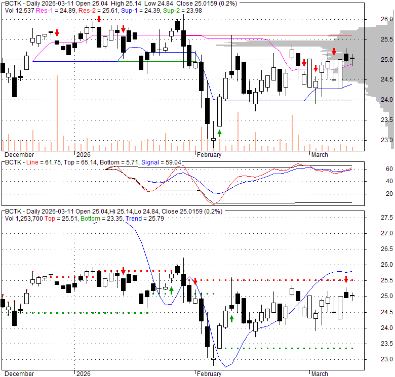 Price has closed below its short-term moving average. Short-term moving average is currently below mid-term; and below long-term moving average. From the relationship between price and moving averages: This stock is BEARISH in short-term; and NEUTRAL in mid-long term.[ BCTK ] has closed above bottom band by 21.4%. Bollinger Bands are 0% narrower than normal.