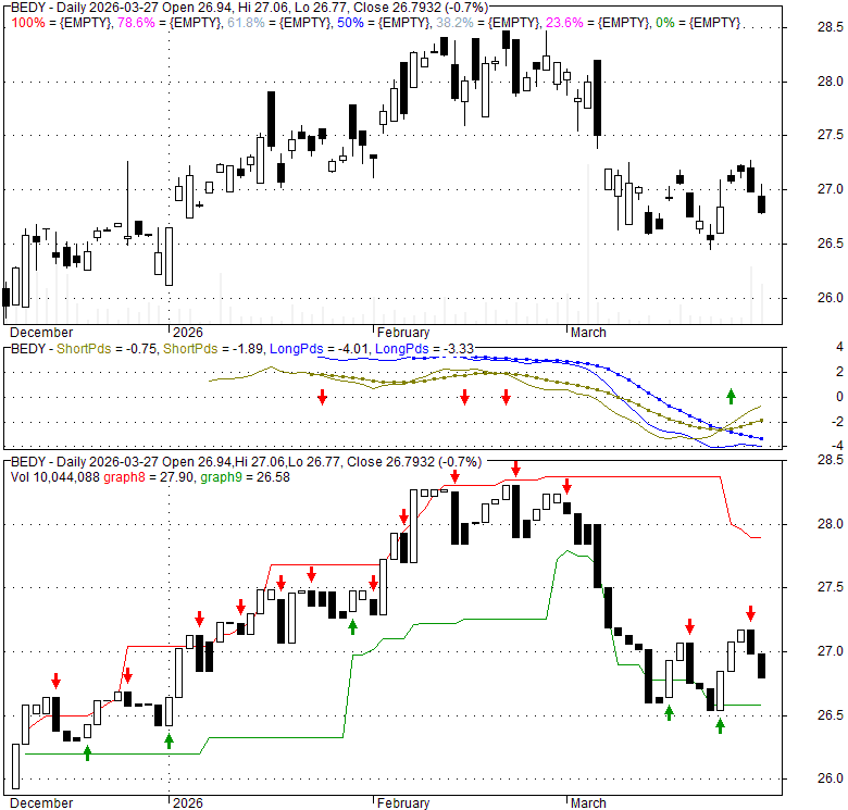 Price has closed below its short-term moving average. Short-term moving average is currently below mid-term; and below long-term moving average. From the relationship between price and moving averages: This stock is BEARISH in short-term; and NEUTRAL in mid-long term.[ BEDY ] has closed above bottom band by 38.1%. Bollinger Bands are 0% narrower than normal.