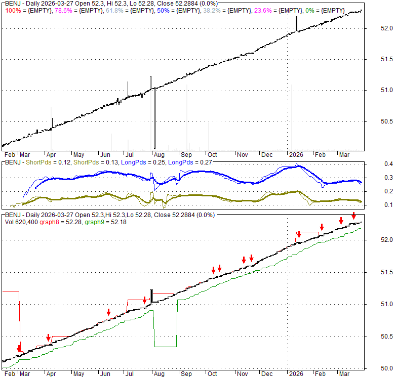 Price has closed above its short-term moving average. Short-term moving average is currently above mid-term; and above long-term moving average. From the relationship between price and moving averages: This stock is BULLISH in short-term; and BULLISH in mid-long term.[ BENJ ] has closed below upper band by 11.0%. Bollinger Bands are 23.6% narrower than normal. The current width of the bands does not suggest anything about the future direction or movement of prices.