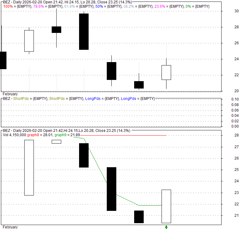 Price has closed below its short-term moving average. Short-term moving average is currently below mid-term; and below long-term moving average. From the relationship between price and moving averages: This stock is NEUTRAL in short-term; and NEUTRAL in mid-long term.[ BEZ ] has closed Bollinger Bands are 0% narrower than normal.