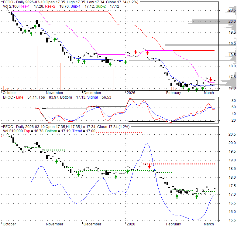 Price has closed above its short-term moving average. Short-term moving average is currently below mid-term; and below long-term moving average. From the relationship between price and moving averages: This stock is NEUTRAL in short-term; and BEARISH in mid-long term.[ BFOC ] has closed below upper band by 21.9%. Bollinger Bands are 0% narrower than normal.