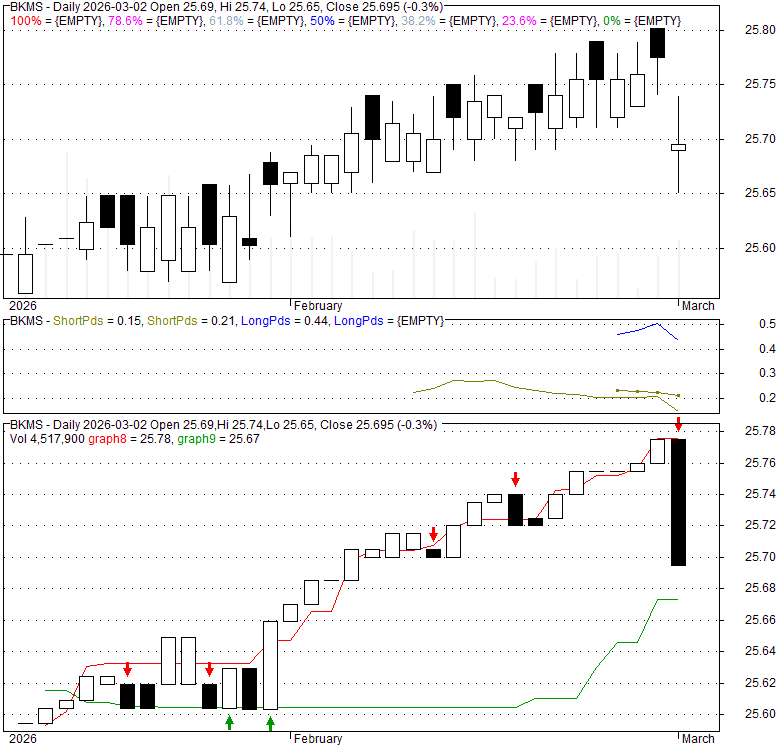 Price has closed below its short-term moving average. Short-term moving average is currently below mid-term; and below long-term moving average. From the relationship between price and moving averages: This stock is NEUTRAL in short-term; and NEUTRAL in mid-long term.[ BKMS ] has closed above bottom band by 9.1%. Bollinger Bands are 0% narrower than normal.