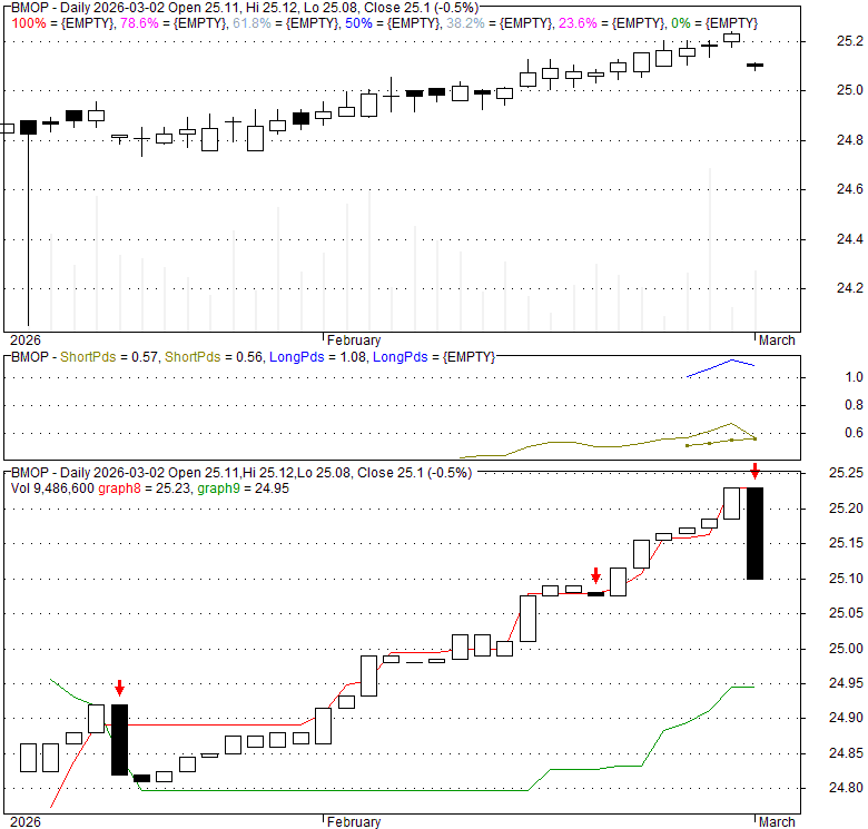 Price has closed below its short-term moving average. Short-term moving average is currently below mid-term; and below long-term moving average. From the relationship between price and moving averages: This stock is NEUTRAL in short-term; and NEUTRAL in mid-long term.[ BMOP ] has closed below upper band by 48.8%. Bollinger Bands are 0% narrower than normal.