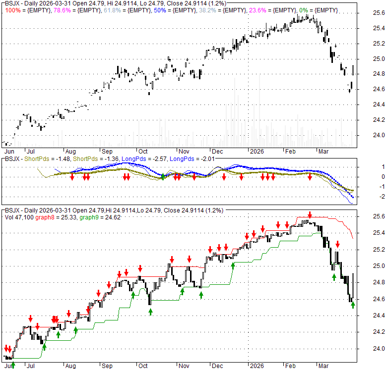 Price has closed above its short-term moving average. Short-term moving average is currently below mid-term; and below long-term moving average. From the relationship between price and moving averages: This stock is NEUTRAL in short-term; and NEUTRAL in mid-long term.[ BSJX ] has closed below upper band by 49.8%. Bollinger Bands are 120.7% wider than normal. The large width of the bands suggest high volatility as compared to its normal range. The bands have been in this wide range for 14 days. This is a sign that the current trend might continue.