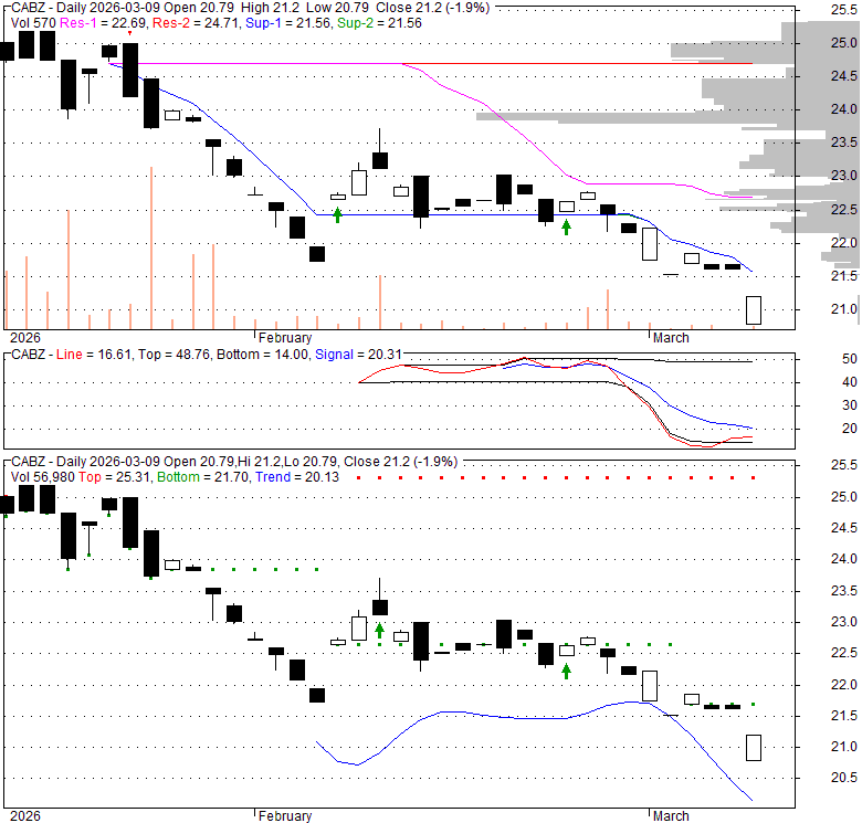 Price has closed above its short-term moving average. Short-term moving average is currently below mid-term; and below long-term moving average. From the relationship between price and moving averages: This stock is NEUTRAL in short-term; and NEUTRAL in mid-long term.[ CABZ ] has closed above bottom band by 47.2%. Bollinger Bands are 0% narrower than normal.