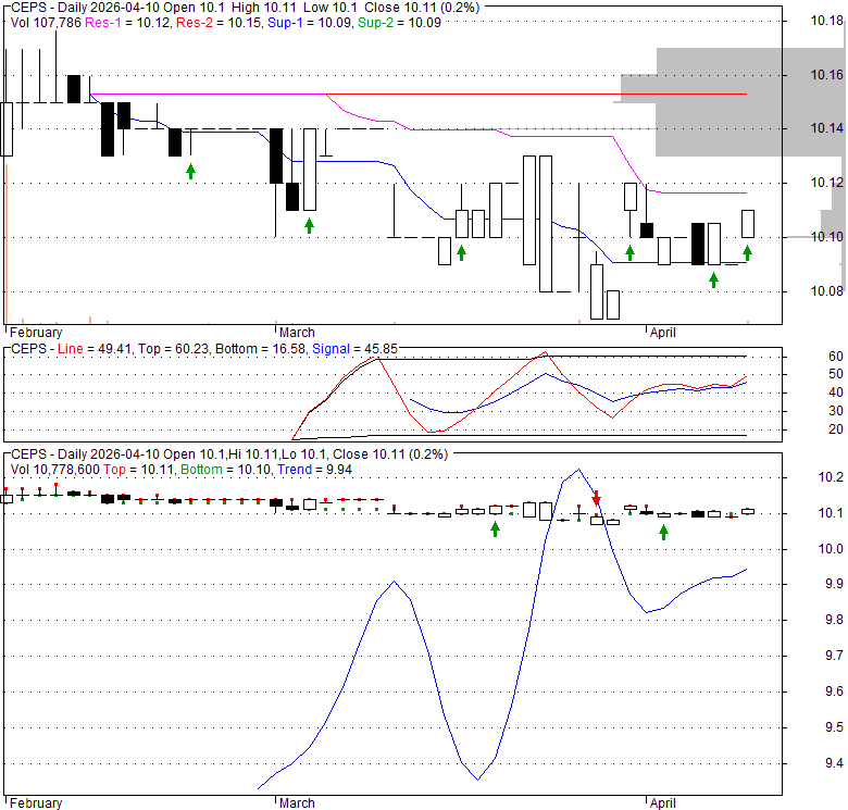 Price has closed above its short-term moving average. Short-term moving average is currently below mid-term; and below long-term moving average. From the relationship between price and moving averages: This stock is NEUTRAL in short-term; and NEUTRAL in mid-long term.[ CEPS ] has closed below upper band by 38.8%. Bollinger Bands are 0% narrower than normal.