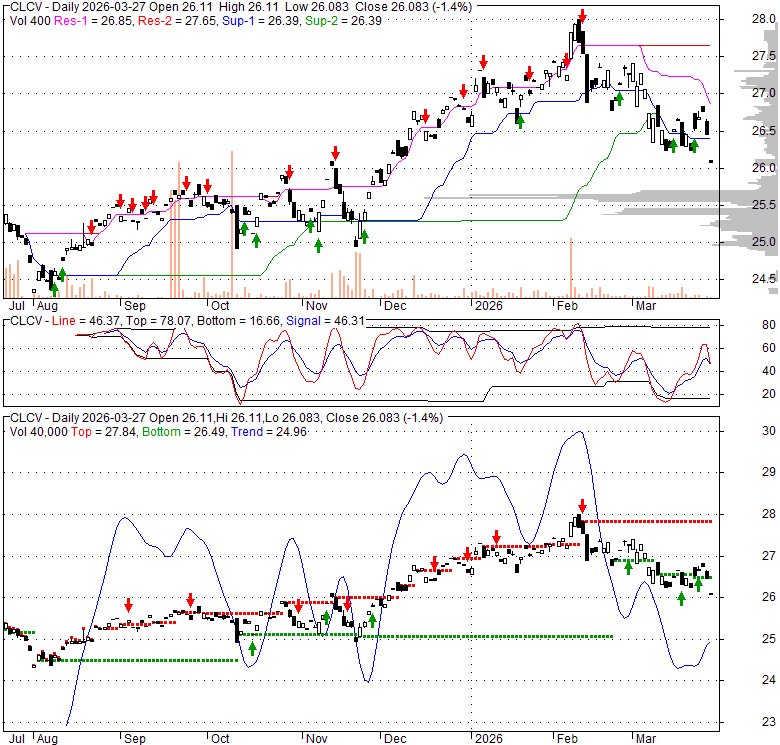 Price has closed below its short-term moving average. Short-term moving average is currently below mid-term; and below long-term moving average. From the relationship between price and moving averages: This stock is BEARISH in short-term; and NEUTRAL in mid-long term.[ CLCV ] has closed below the lower bollinger band by 0.2%. If price is in a downtrend band; this downward trend might continue. However a short term pullback inside the band is likely. Bollinger Bands are 27.1% narrower than normal. The current width of the bands does not suggest anything about the future direction or movement of prices.