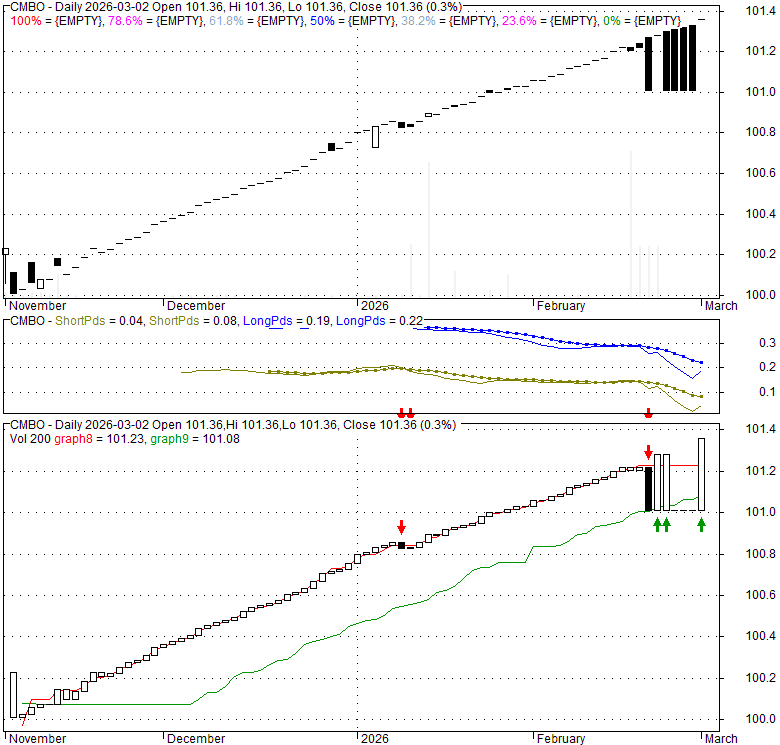 Price has closed above its short-term moving average. Short-term moving average is currently above mid-term; and below long-term moving average. From the relationship between price and moving averages: This stock is BULLISH in short-term; and NEUTRAL in mid-long term.[ CMBO ] has closed Bollinger Bands are 0% narrower than normal.