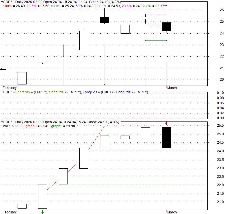 Price has closed below its short-term moving average. Short-term moving average is currently below mid-term; and below long-term moving average. From the relationship between price and moving averages: This stock is NEUTRAL in short-term; and NEUTRAL in mid-long term.[ COPZ ] has closed Bollinger Bands are 0% narrower than normal.