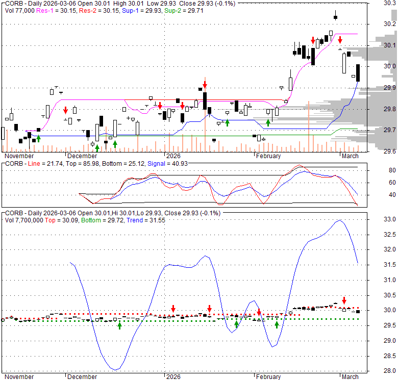 Price has closed below its short-term moving average. Short-term moving average is currently above mid-term; and below long-term moving average. From the relationship between price and moving averages: This stock is NEUTRAL in short-term; and NEUTRAL in mid-long term.[ CORB ] has closed above bottom band by 2.5%. Bollinger Bands are 0% narrower than normal.